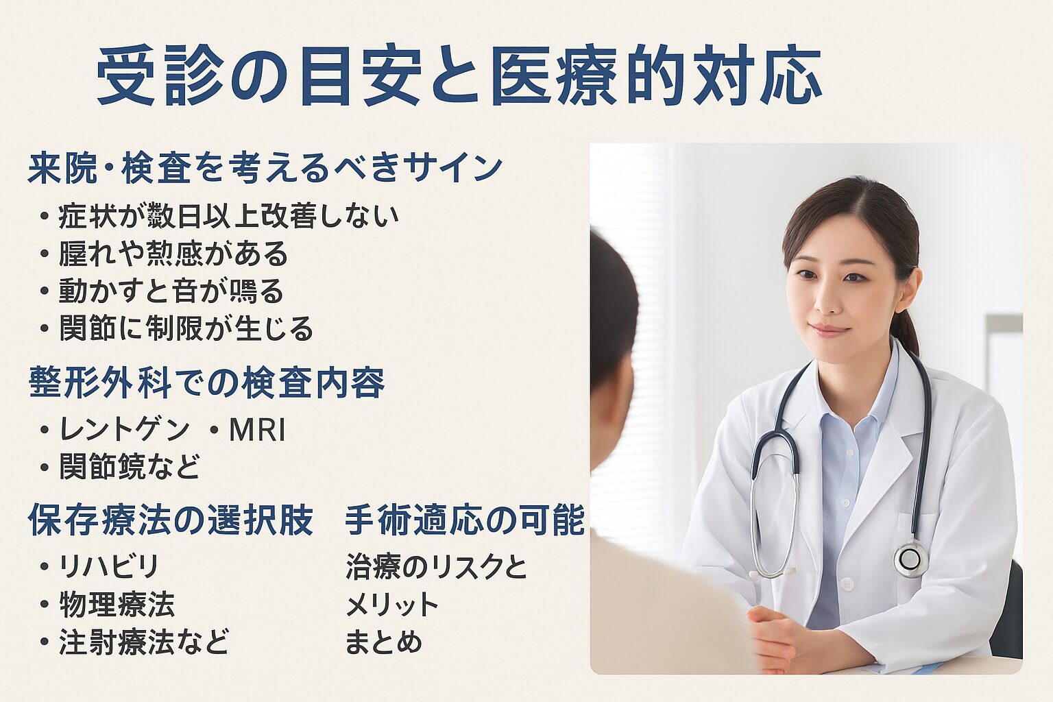 膝の違和感や重さが数日経っても改善しない場合や、膝に腫れや熱感があるときは、早めに整形外科で検査を受けることが推奨されています。特に、膝を動かすと「ポキッ」「ミシッ」といった音が鳴る、あるいは膝の曲げ伸ばしに制限が出ている場合は、関節内の組織に何らかの変化が起きている可能性があると考えられています。「そのうち治る」と放置してしまうと、進行性の関節変性や半月板の損傷などが悪化するリスクもあるため、一定期間様子を見ても変化がないときは来院の目安とされます(引用元:くまのみ整骨院)。