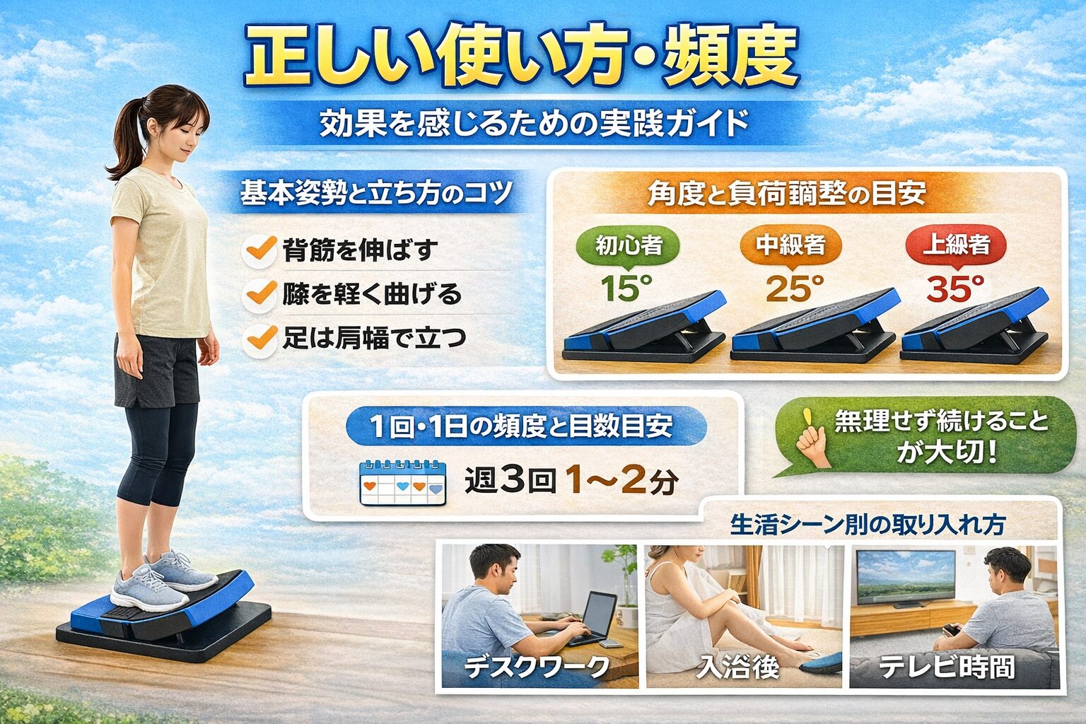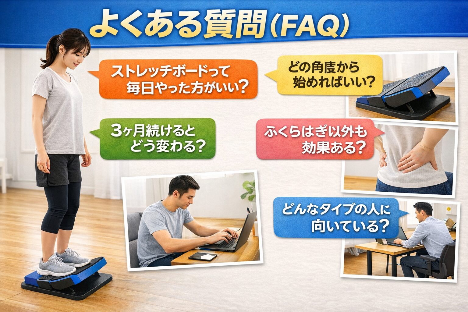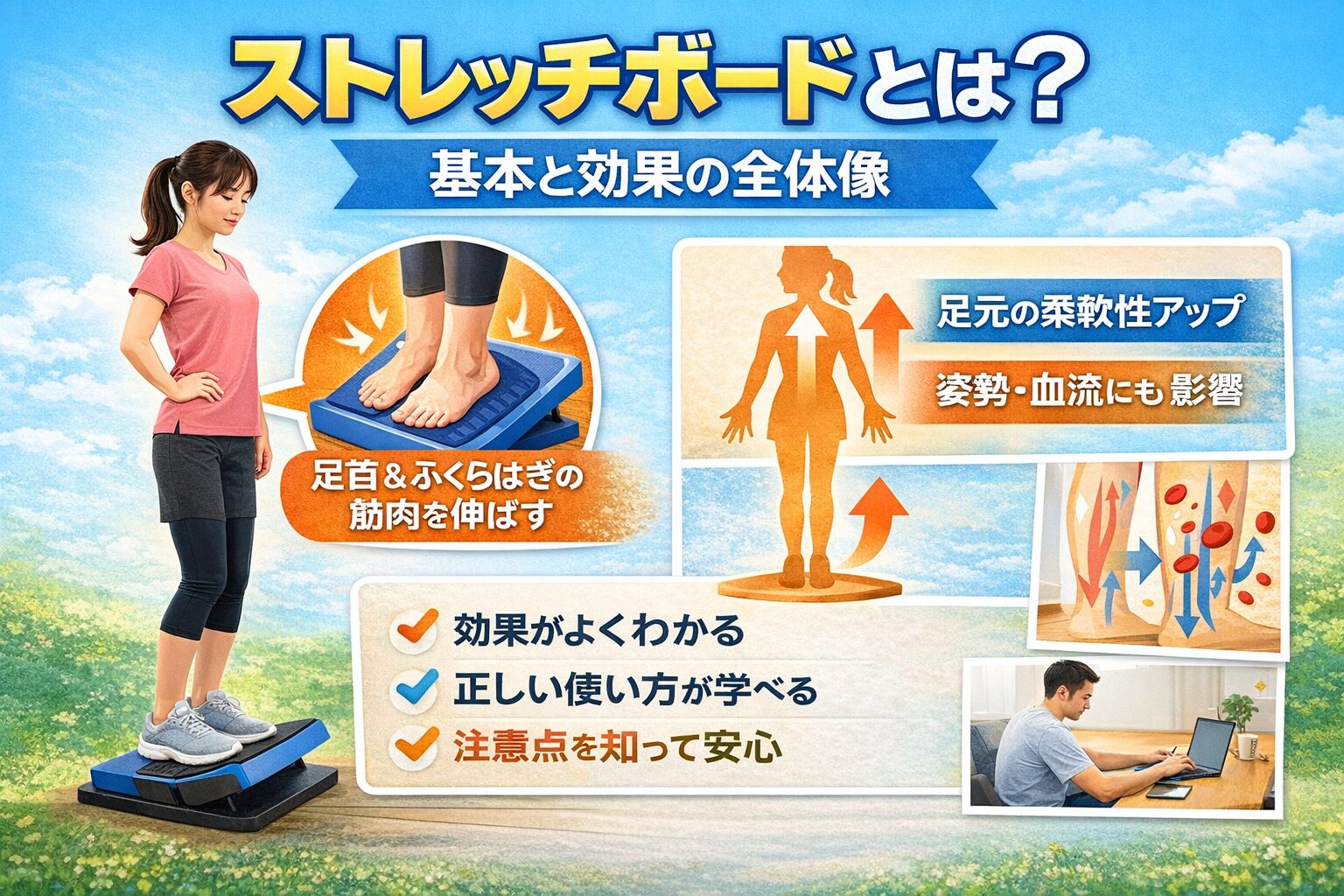 ストレッチボードで足首の可動域を広げることで、体全体のバランスが整いやすくなり、結果として姿勢や関節への負担軽減が期待できる、という考え方です。
