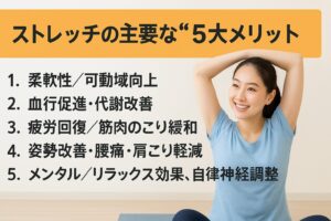 「ストレッチって、結局何がいいの?」とよく聞かれます。実は、ストレッチには体の内外にうれしい変化がたくさんあるんです。ここでは、代表的な“5大メリット”を具体例と根拠を交えながら紹介していきますね。