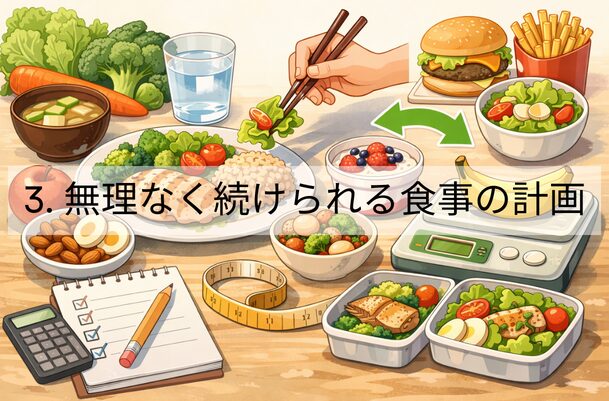短期(1〜2週間):行動を1つ決めて試す(例:夜だけ主食控えめ)。