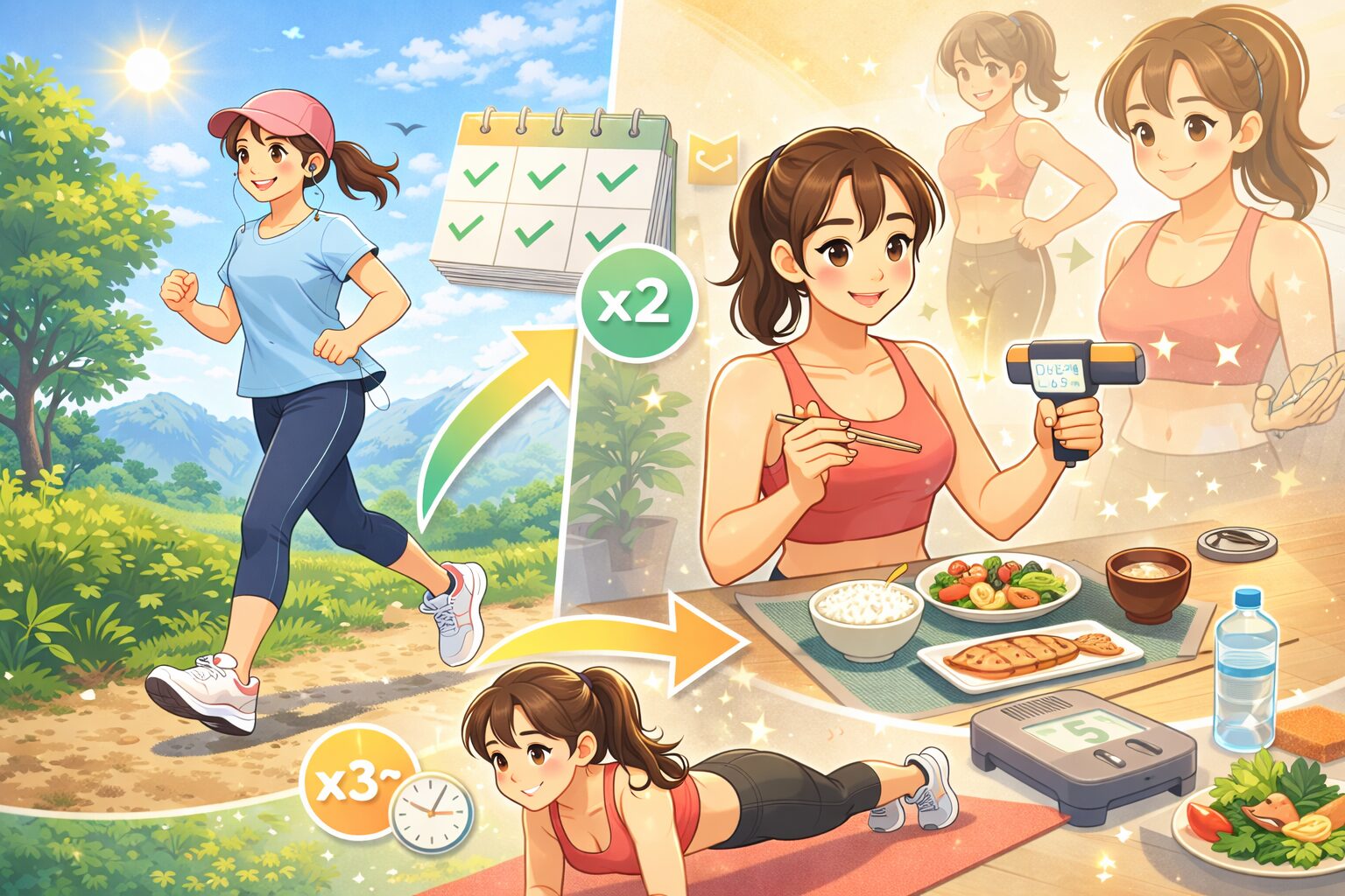ダイエットでは、運動だけに頼るより、食事の内容も意識することが大切とされています。例えば、バランスの良い食事を取りながら運動を続けることで、エネルギーの摂取と消費のバランスを見直しやすくなると言われています。食事を極端に減らすより、主食・主菜・副菜を意識した食事と運動を組み合わせる方法が紹介されることが多いです。