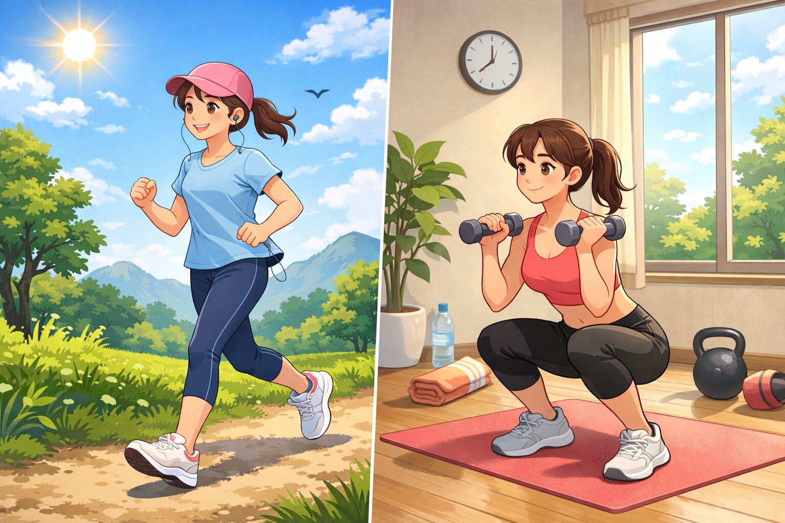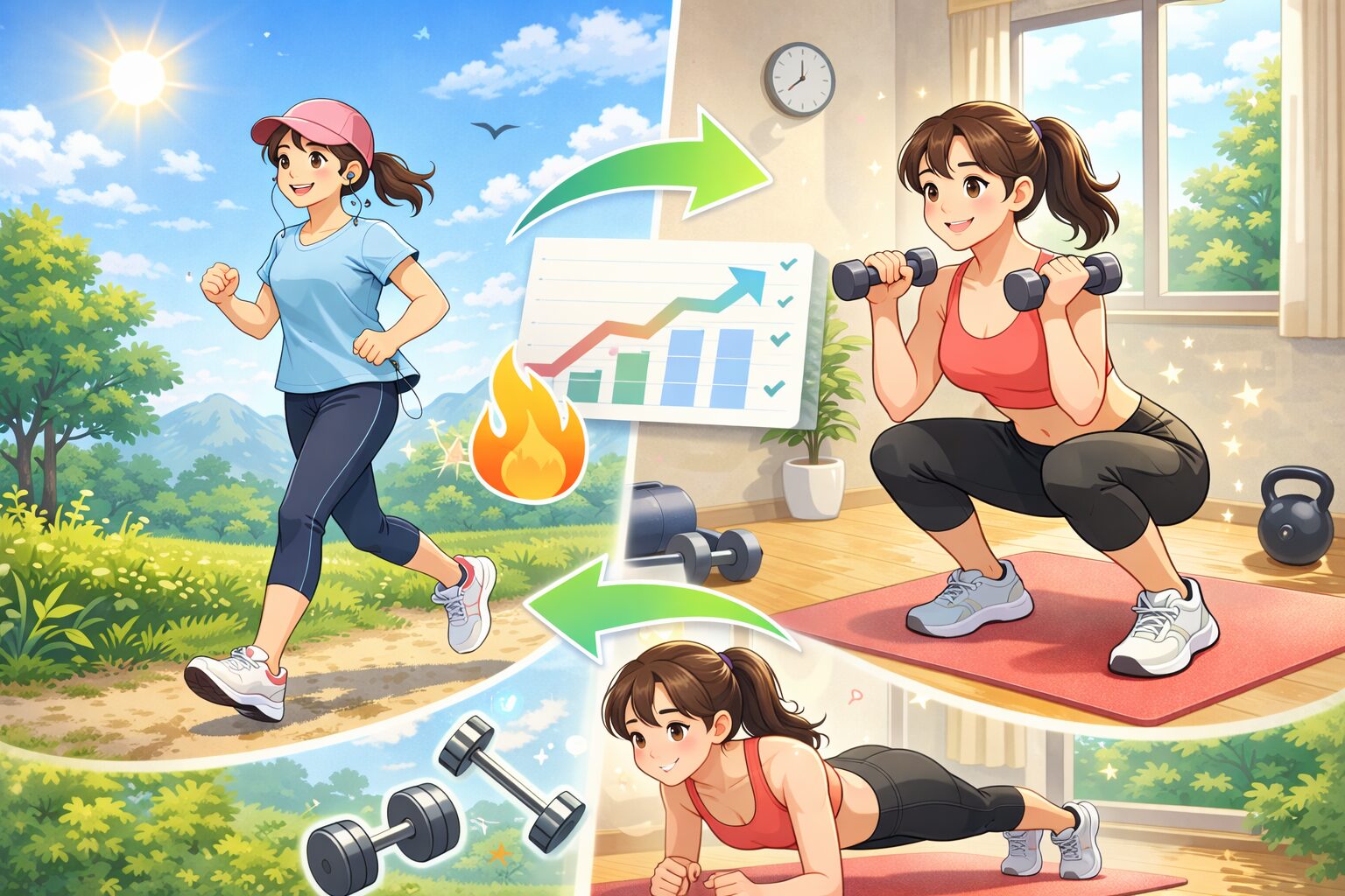 じゃあ、どちらか一方でいいのかというと、そうとは言い切れないようです。参考記事では、有酸素運動で消費エネルギーを増やしつつ、筋トレで筋肉量を意識する組み合わせが効率的と紹介されています。たとえば、先に筋トレをしてからウォーキングを行う流れもよく見られます。こうした形なら、無理なく続けながら運動の役割を分けて考えやすいです。ダイエットでは、ひとつに絞るより、両方をバランスよく取り入れる方法が現実的だと言われています。