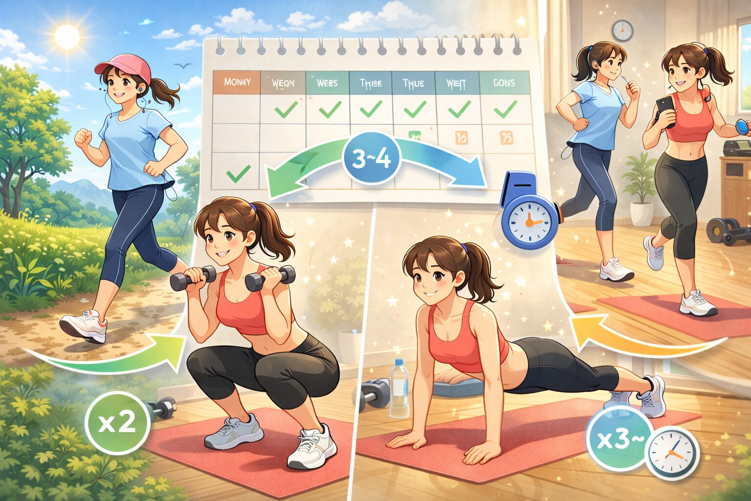 「もう少ししっかり運動したい」という人なら、週3〜4回を目安にするとバランスが取りやすいです。例えば、週2回は有酸素運動、残りの日は筋トレという形に分ける方法があります。有酸素運動ではウォーキングやジョギング、筋トレではスクワットやプランクなどを取り入れると、体のいろいろな筋肉を使いやすいです。このように運動の種類を分けることで、疲れすぎず続けやすいスケジュールになると言われています。