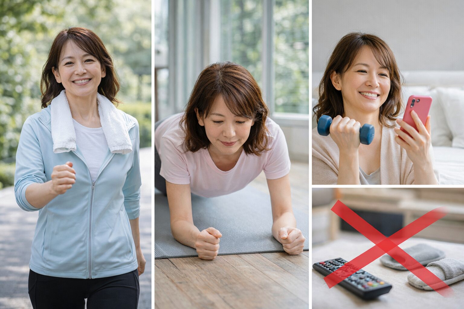 「運動しないといけないのはわかるけど、時間がないんだよね…」という声、40代女性では本当によくあります。そんなときは、ハードな運動をいきなり始めるよりも、日常に取り入れやすい動きからスタートするほうが続きやすいと言われています。たとえばウォーキングのような有酸素運動は、特別な準備がいらず、通勤や買い物のついでにも取り入れやすい方法です。そこにスクワットや体幹トレーニングなどの軽い筋トレを組み合わせることで、筋肉量の維持にもつながると考えられています。さらに「歯みがきしながらスクワット」「テレビを見ながらストレッチ」といった、いわゆる“ながら運動”を取り入れると、無理なく習慣化しやすいと言われています。完璧にやろうとするより、「これならできそう」と思えるレベルから始めることが大切です。