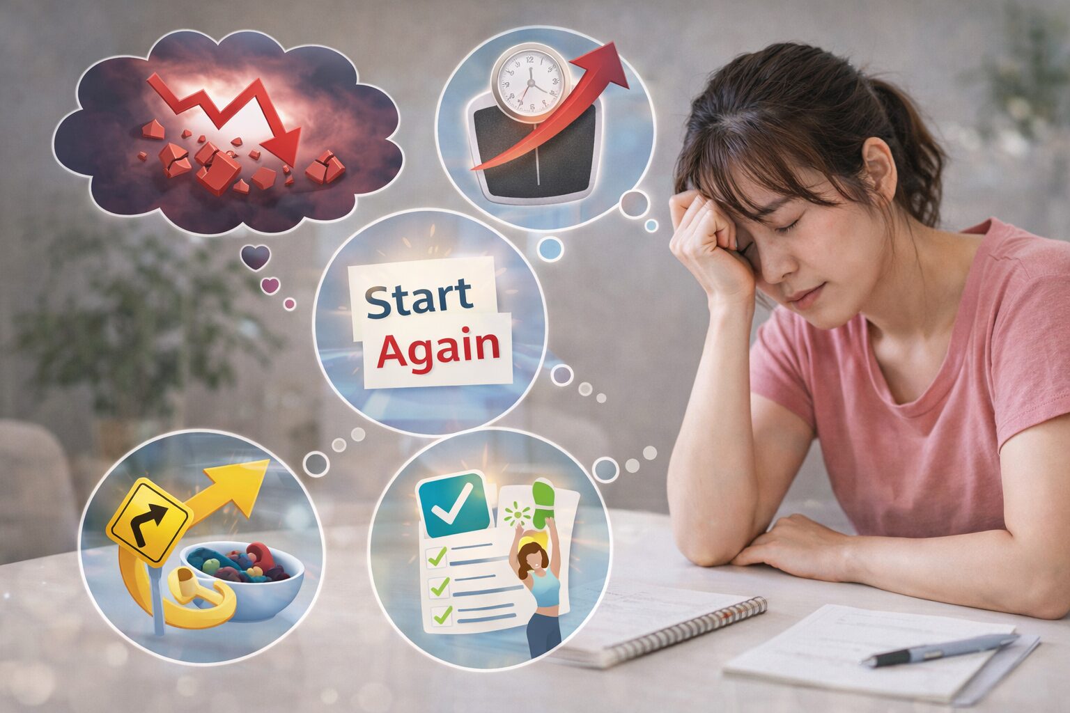 ダイエット 挫折 原因 対策を考えるときは、調子がいい日の理想より、しんどい日でも続けられる線を作ることが大切です。止まらない人より、止まっても戻れる人のほうが、結果的に続きやすいと言われています。