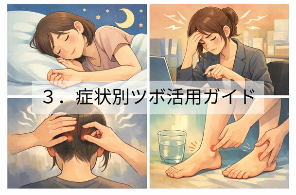 そんな声に応えるために、ここでは悩み別にツボを選びやすくまとめます。あくまでセルフケアの一つとして取り入れられている方法と言われていますので、無理のない範囲で試してみてください。