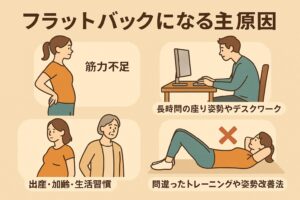 フラットバックは単なる姿勢の癖ではなく、筋力や生活習慣など複数の要因が重なって起こると考えられています(引用元:https://stretchex.jp/6361)。