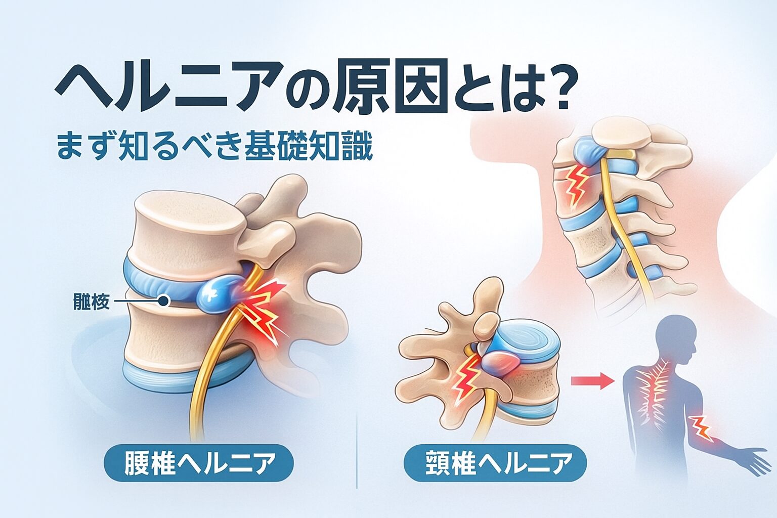 「ヘルニアって、そもそもどうして起こるの?」と聞かれることがよくあります。実際、腰や首に痛みやしびれが出ると不安になりますよね。まずは、ヘルニアの原因を理解するために、体の中で何が起きているのかを順番に見ていきましょう。