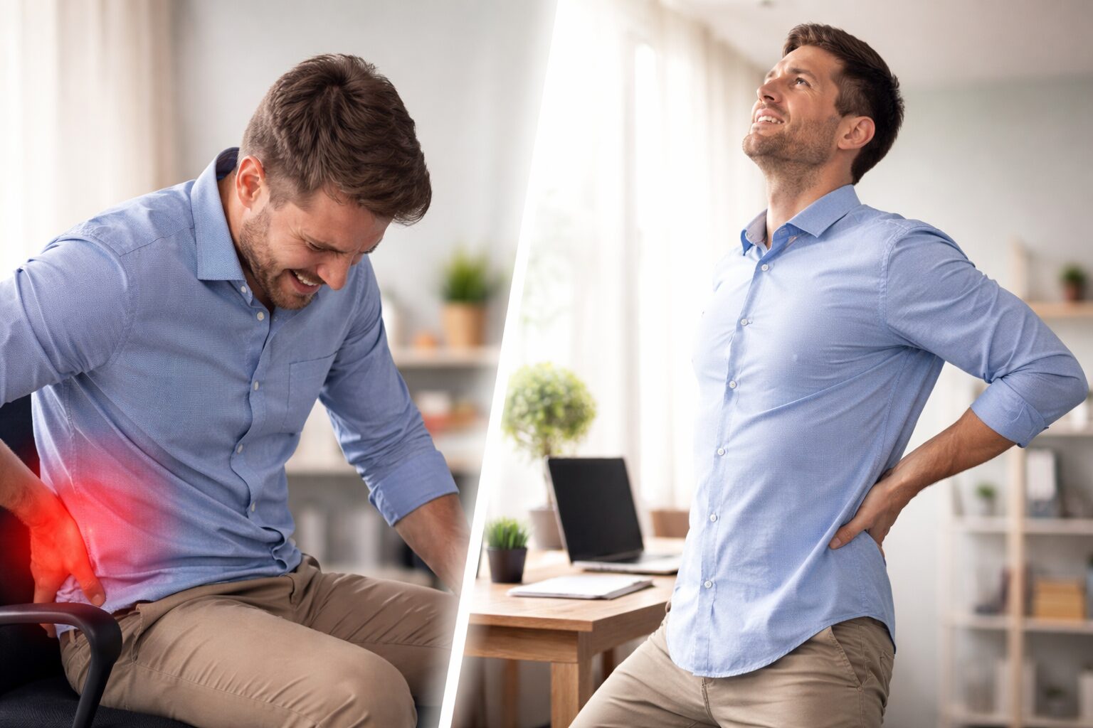 「座ると痛い、でも立つと少し楽になる。これってやっぱりヘルニア?」と感じる方は多いです。たしかに、参考記事でも腰椎椎間板ヘルニアは原因のひとつとして挙げられており、つぶれた椎間板が神経を圧迫すると、腰の痛みやしびれが出やすくなると言われています。とくに座る姿勢では腰まわりに負担が集まりやすく、違和感が強まることがあるようです。