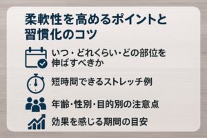 とはいえ、「もう遅いのでは?」と考える必要はありません。年齢や性別よりも、どれだけ日常的に体を動かしているかの方が柔軟性に関係していると言われています。短時間のストレッチでも習慣になっている人は、維持しやすいようです。