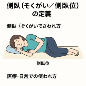 「側臥(そくがい)」とは、体を横向きにして寝る姿勢のことを指します。医学的には「側臥位」とも呼ばれ、ベッドや布団の上で体を横に傾け、肩と腰を床につけた状態をいいます。一般的には「横向き寝」と表現されることも多く、日常生活でも馴染みのある姿勢です。この体位は、古くから医療の現場で使われてきた経緯があり、患者の介助や検査を行う際の基本的な体位の一つとされています。