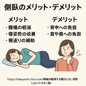 つまり、側臥は腰や姿勢に良い面がある一方で、背中や首に負担がかかる可能性もあるため、「メリットとデメリットの両面を理解して取り入れる」ことが求められると言えるでしょう。
