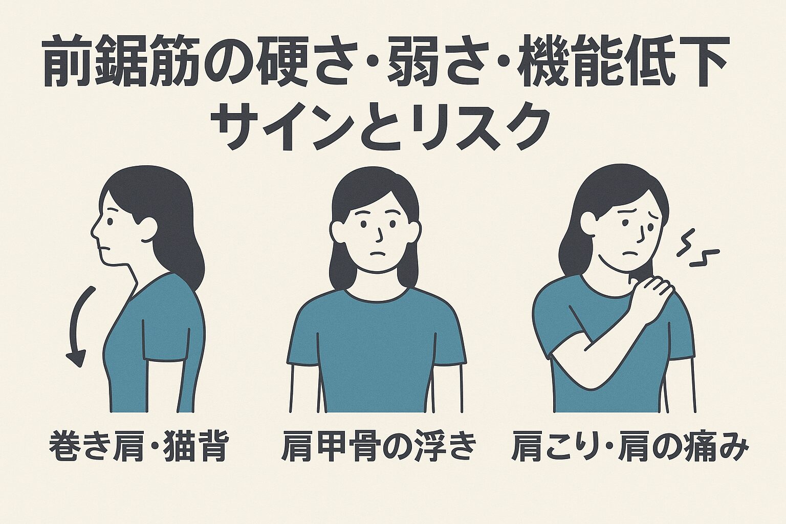 「ねえ、最近なんか肩が丸まってきたな…」と感じたら、実は 前鋸筋 に“硬さ”が出ているサインかもしれません。例えば、次のような変化が起きやすいと言われています。