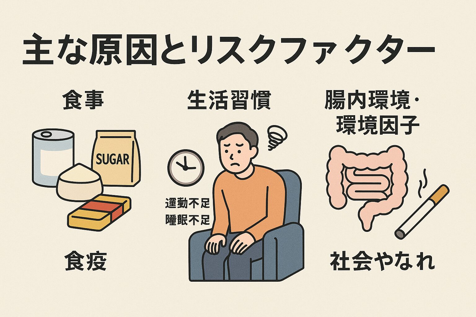 例えば、悪玉菌が優勢になったり、腸壁のバリア機能が低下したりすると、腸内の物質が血流に入り込み、体が“異物を排除しよう”と炎症反応を起こすきっかけになるとも考えられています。さらに、たばこ・大気汚染・化学物質といった環境因子も、体にとって“慢性的な小さな刺激”となり得て、炎症反応を内側でくすぶらせる原因になるという報告もあります。引用元:https://chokenko.com/about-intestinal-environment/understanding-the-relationship-between-gut-microbiota-and-inflammation/