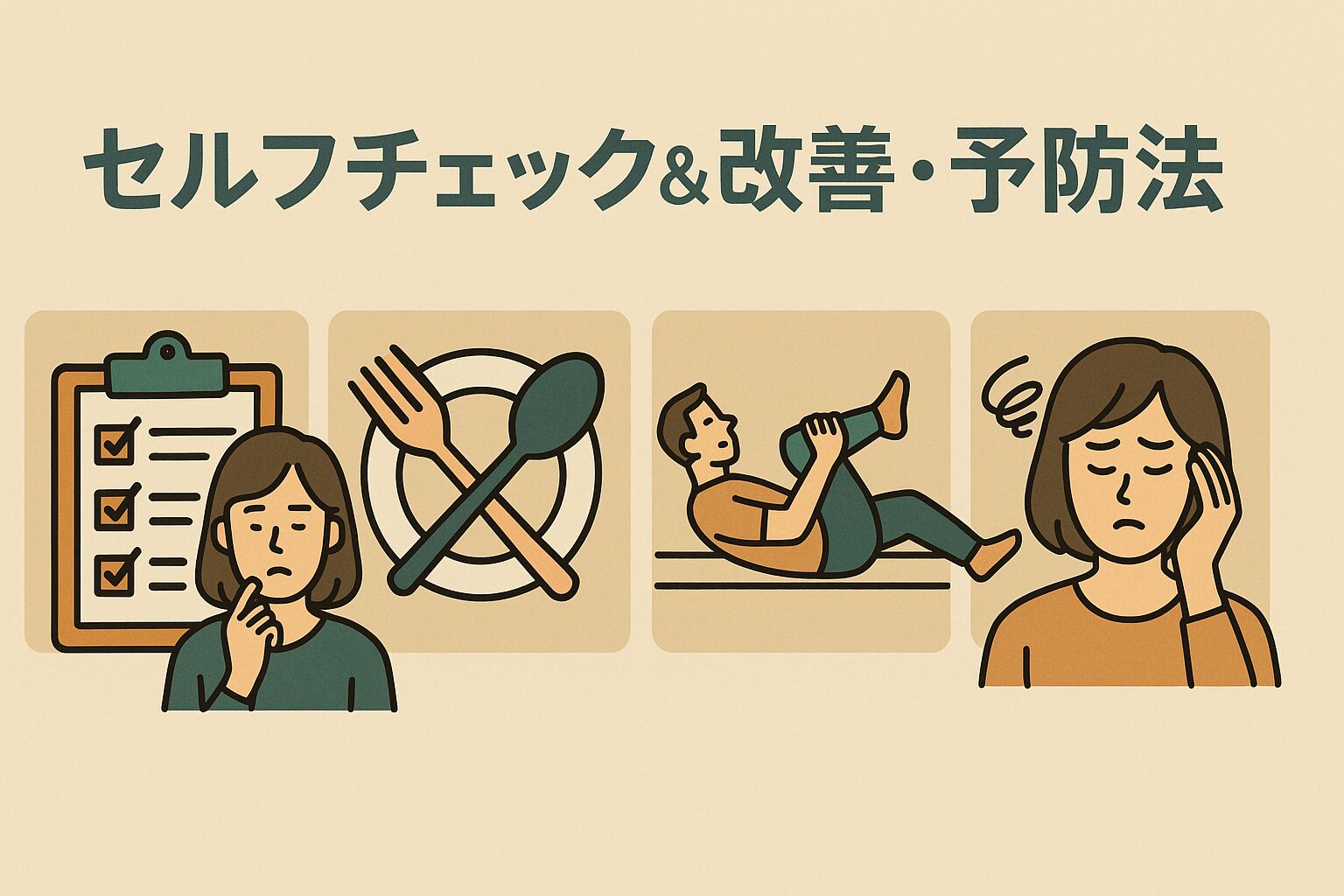 生活習慣では、加工食品が多くなっていないか、運動不足が続いていないか、お酒やタバコの頻度が増えていないかなども確認しておきたい部分です。