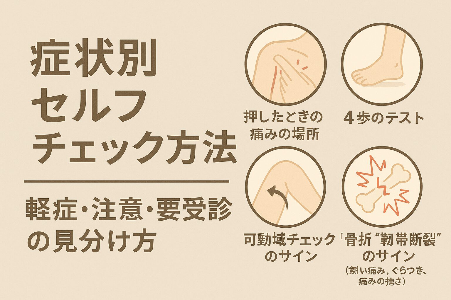 そう感じるサインとして、鋭い痛みが続く、足首がぐらつく感じがある、少し動かすだけでも強く痛むといった状態が挙げられています。これらは骨折や靭帯断裂の可能性も否定できないため、早めに専門家に体の状態を確認してもらうことが大切と言われています。