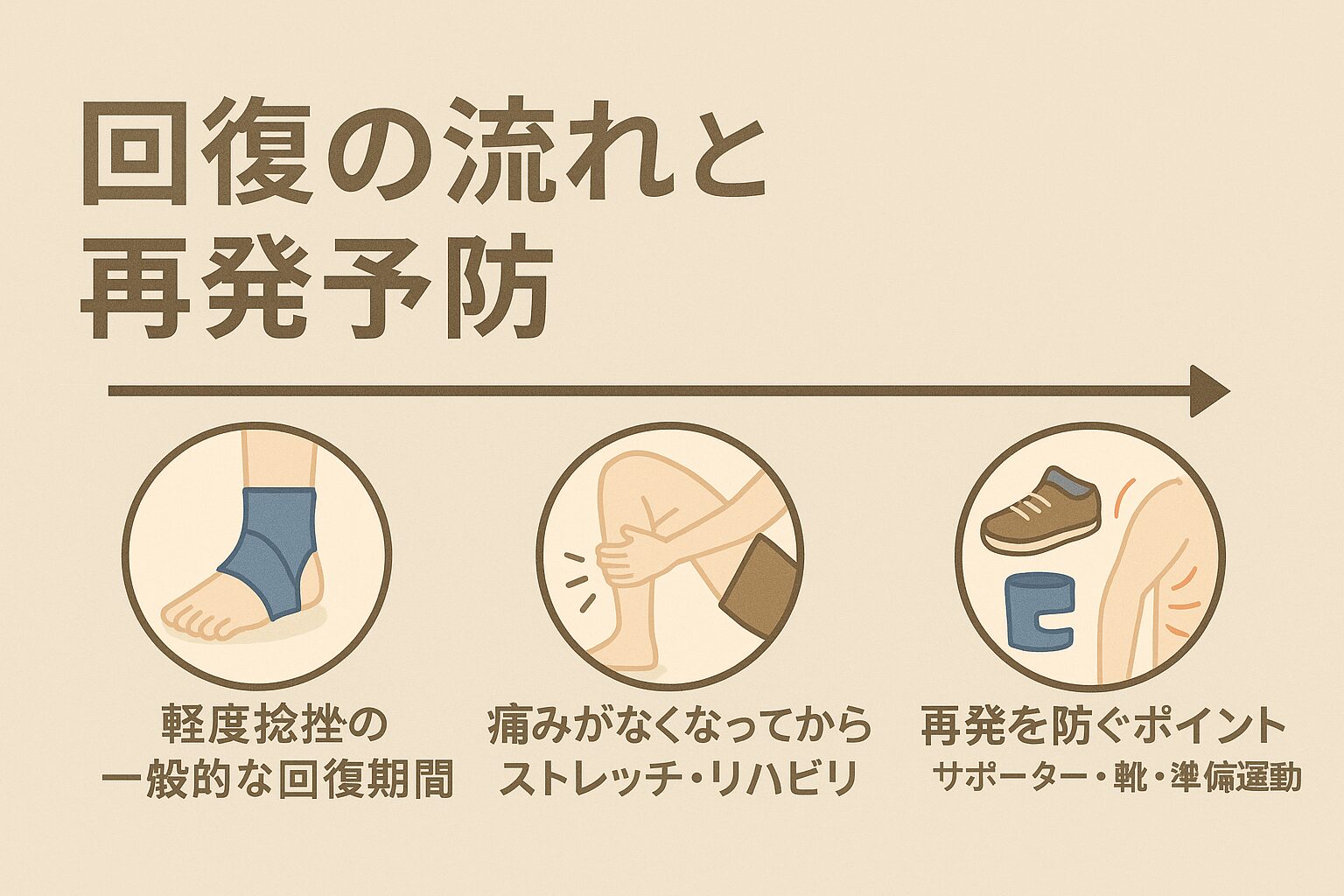 実はここが、再発を分けるポイントと言われています。痛みが落ち着いた後は、足首をゆっくり動かす可動域ストレッチや、体重をかけたバランス練習などが取り入れられることが多いようです。