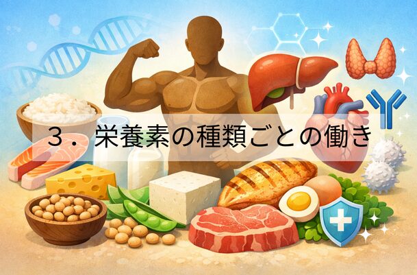 → **機能を正常に保つ(調子を整える)**役目を、ビタミンやミネラルが担うと言われています。主役というより“サポート役”のイメージですね。