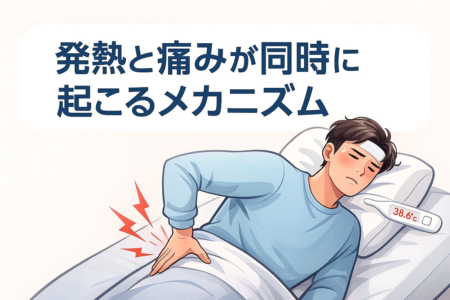 発熱が起こると、体の中では免疫細胞が活発になり、炎症物質が増えるそうです。この炎症物質が筋肉にも影響し、「全身が痛い」「筋肉痛みたいにツラい」という状態につながりやすいと言われていて、腰痛もその一つとして出る場合があるようです。