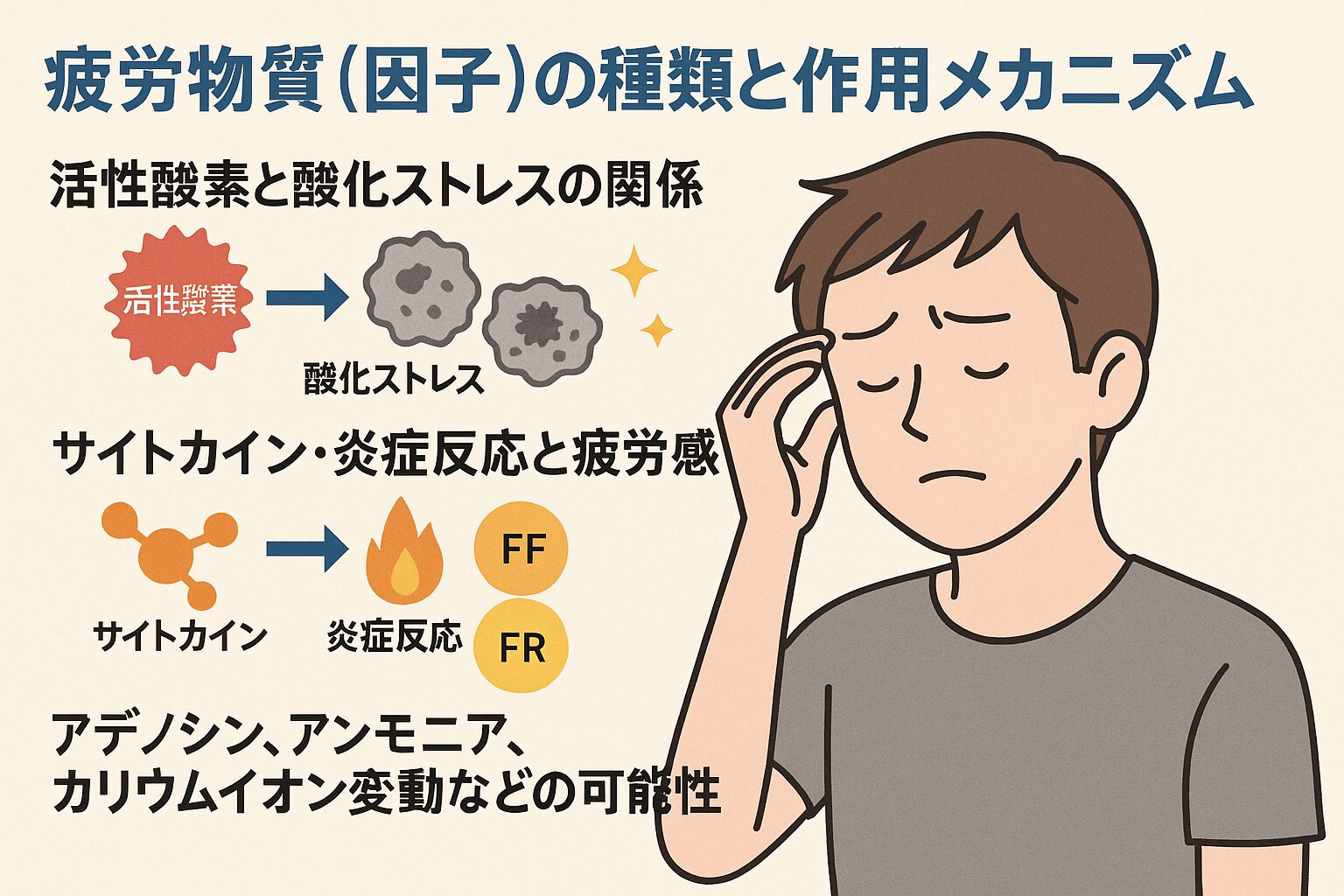 では、本当の“疲労物質”とは何なのでしょうか。現在注目されているのが、活性酸素や炎症性サイトカイン、そして**FF(Fatigue Factor)**と呼ばれる疲労因子です。