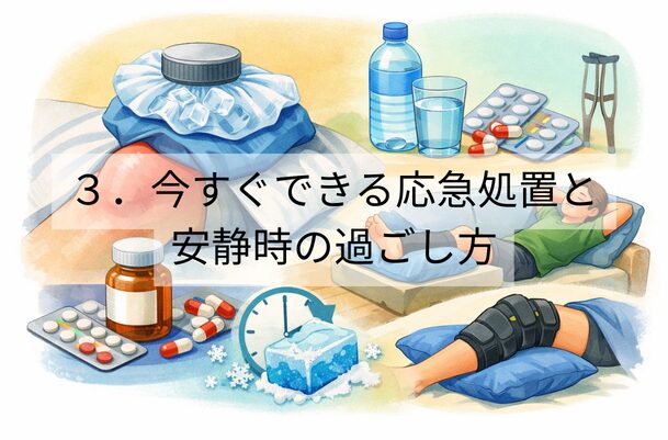筆者: 冷却は助けになることもある一方、長時間当てっぱなしだと冷やし過ぎになりやすいです。たとえば10〜15分程度を目安に区切って、皮膚の感覚を確認しながら行う、といったやり方が現実的と言われています。痛みで歩けない、赤みや熱感が強い、つらさが引かない…そんなときは、我慢で押し切らず相談先を確保しておくのが大切です。