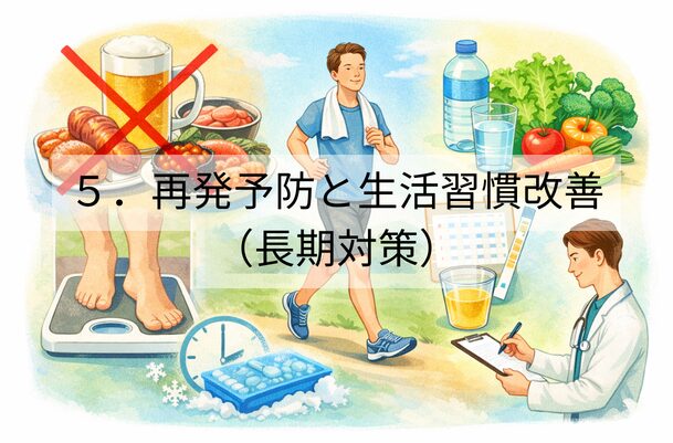 筆者: 実はここが大事と言われています。発作が改善しても、尿酸値が高い状態が続くと再発しやすいとされており、生活習慣の見直しや継続的な管理が重要になるそうです。痛風・尿酸財団でも、発作後の尿酸コントロールが再発予防につながる趣旨で説明されています。
