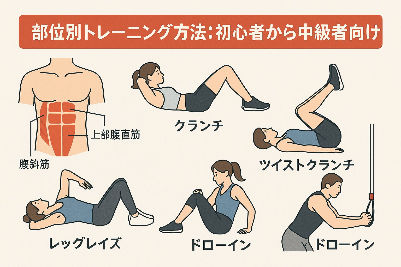こんにちは。今回は「部位別」にお腹の筋肉を鍛えるトレーニング方法を、初心者〜中級者向けに紹介していきます。自宅で器具なしでも、ジムやチューブ・ダンベルを使ったバリエーションでもできるように構成しました。それでは一緒に見ていきましょう。