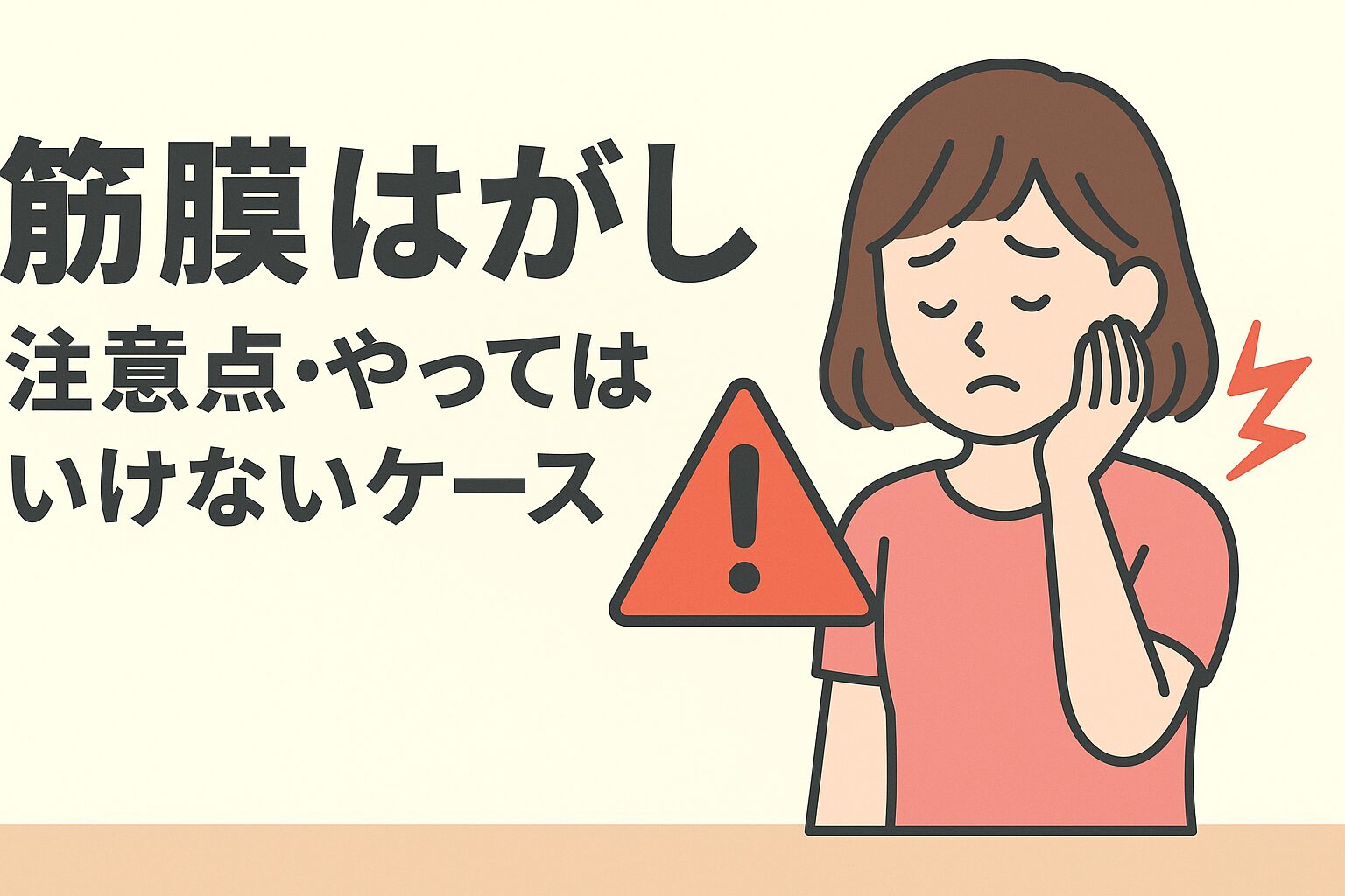 セルフ筋膜はがしは気持ちよさを感じる範囲で行うケアと言われています。とはいえ、ズキッとする急な痛みや熱感があるとき、しびれ・力が入りにくい感じが出ているときは、無理に押さず様子を見るほうがよいそうです。痛みの原因が筋膜以外にある可能性もあるため、続く場合は専門家に相談する流れが安心とされています。おかじま接骨院