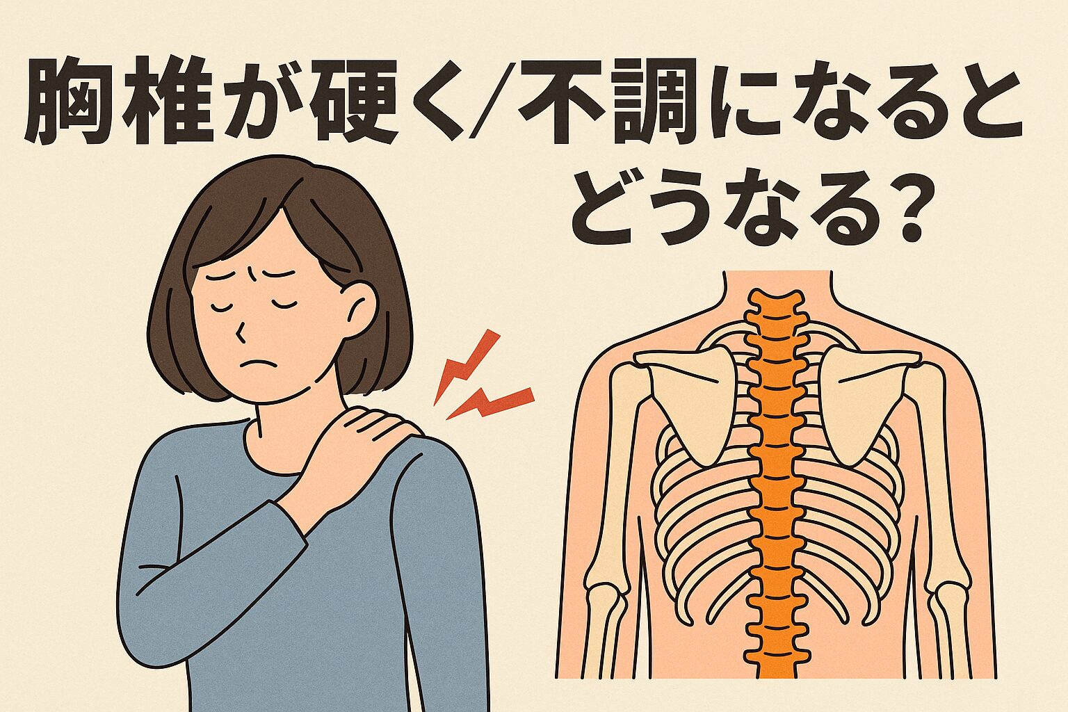 まず、症状についてですが、胸椎が硬くなると「肩や背中の張り・重さ」が出やすく、さらに「呼吸が浅く感じる」「猫背や胸が開かない姿勢になりやすい」といった傾向が報告されています。例えば、肋骨・胸骨・胸椎で形成される胸郭の動きが制限されると、呼吸が浅くなる可能性が指摘されているのです。引用元: https://www.egao-hanayoga.com/post/chest-mobility-and-health (“身体が重く感じる…もしかすると …胸椎が硬くなったということかもしれません”)50歳からの健康づくり 笑顔の花ヨガ また、胸椎の動き(可動性)が低くなることで、隣接する頸椎や腰椎に負担がかかり、「肩関節や腰へ痛みや可動性低下が波及する」ことも言われています。引用元: https://www.nikkori-sinkyuseikotsu.com/archives/6989.html (“胸椎の可動性低下すると、その上下にある頸椎や腰椎に負担が集中”)nikkori-sinkyuseikotsu.com