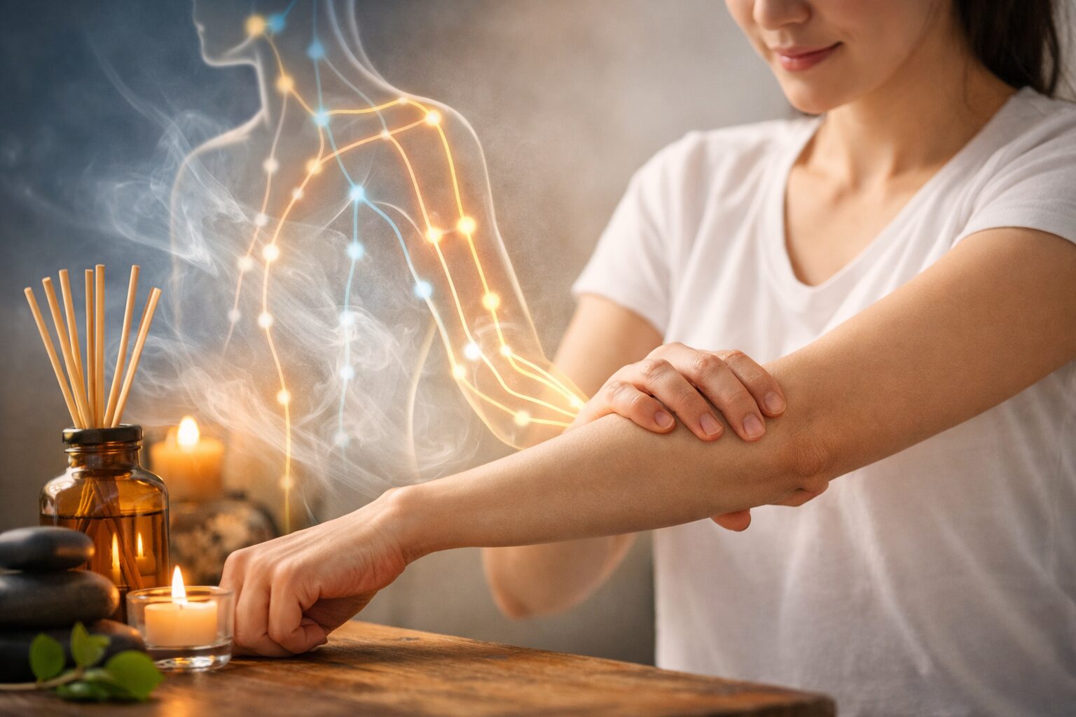 東洋医学では、体の中を気や血が巡り、その通り道を経絡と呼ぶと言われています。ツボはその経絡の上にある大事な地点とされ、やさしく刺激することで巡りを整える考え方があります。「腕の不調なのに肩まで関係あるの?」と思うかもしれませんが、経絡は一部分だけで完結せず、広くつながっているとされています。