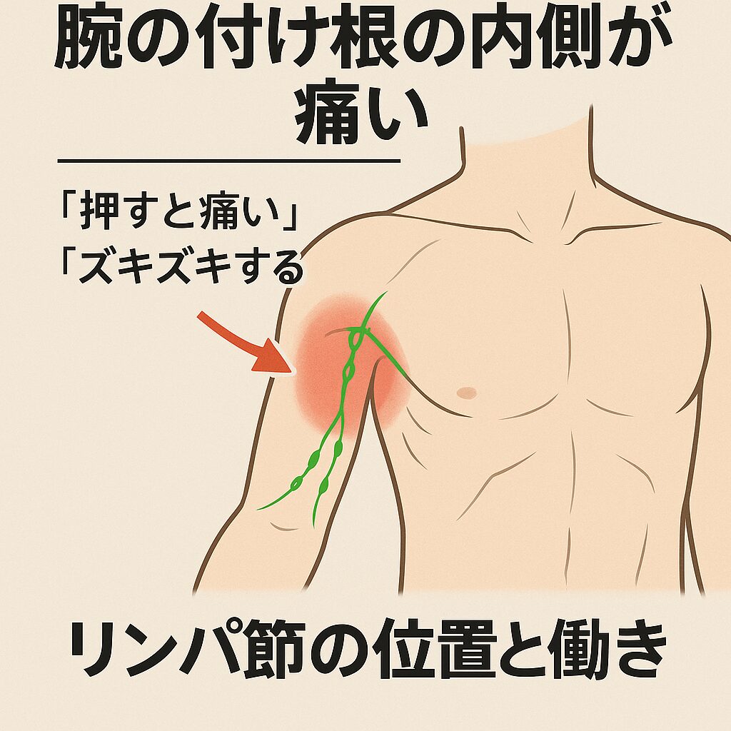 腕の付け根の内側の痛みで“リンパ”が候補になる理由は、腋窩(えきか)リンパ節がこのエリアに集まっているためと言われています。