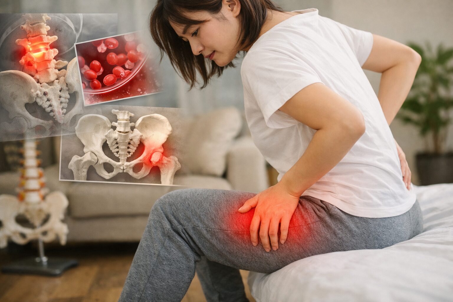 まず多いのが、腰まわりやお尻、太ももの筋肉が張っているパターンです。長時間座りっぱなしだったり、逆に立ちっぱなしが続いたりすると、筋肉がこわばって、重だるさとして出やすいと言われています。「ただ疲れているだけかも」と思いやすいですが、こうした積み重ねが不調の入口になることもあります。