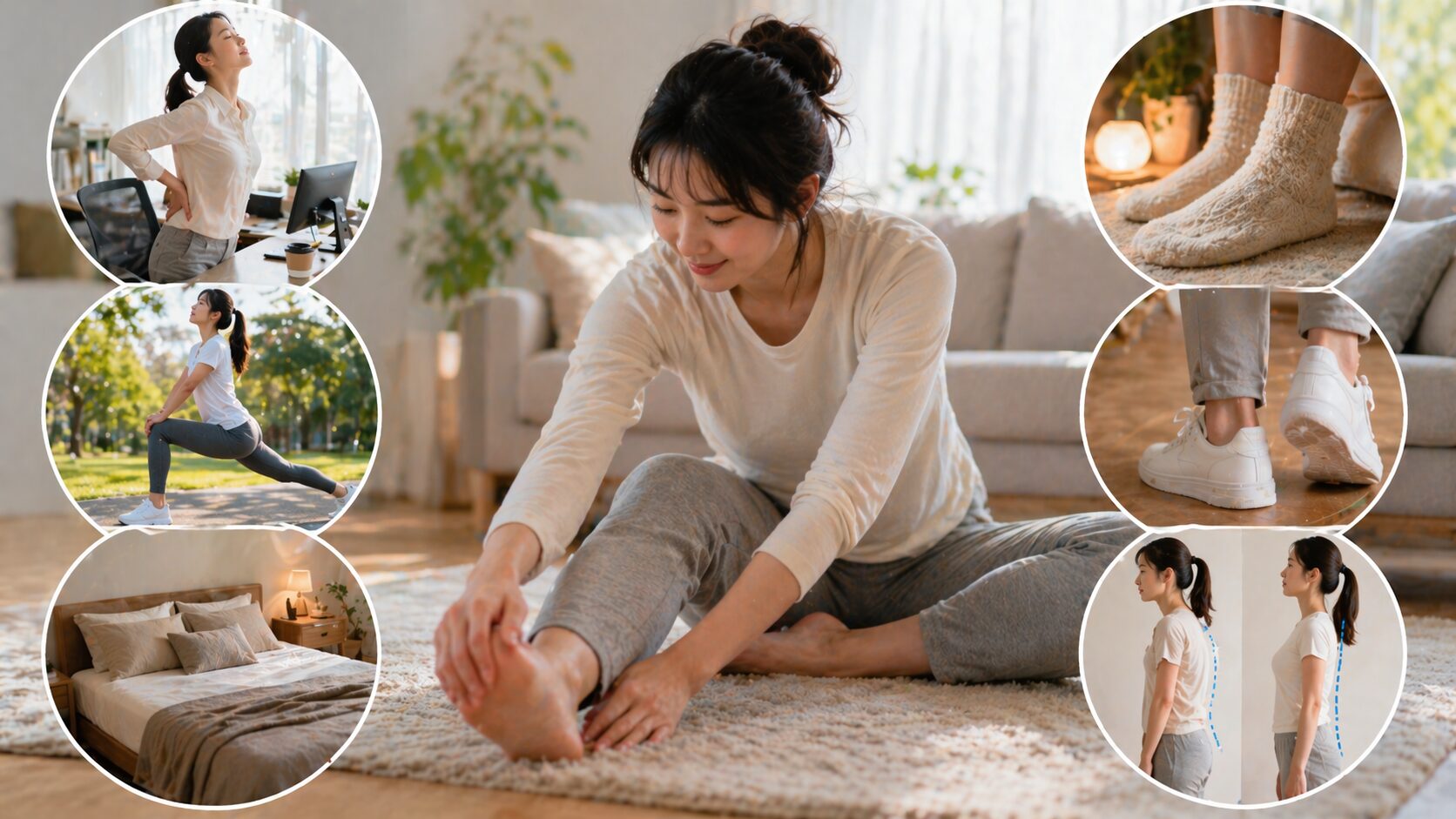 ハードな運動じゃなくても大丈夫です。「軽く体を動かす」ことが大切と言われています。たとえば、寝る前にふくらはぎを伸ばしたり、足裏をほぐしたりするだけでも、筋肉のこわばりを防ぎやすくなるとされています。