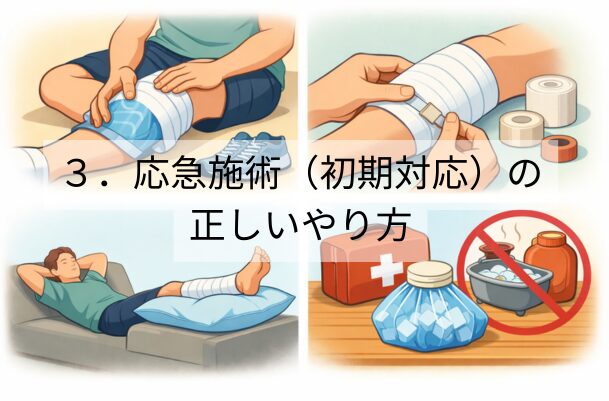 RICE(安静・冷却・圧迫・挙上)の手順をざっくり確認