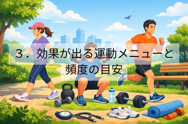 筆者「いきなり頑張りすぎないのがコツと言われています。たとえば“歩く+軽い筋トレ”のセットが無難です。歩行と同等以上の強度の身体活動を1日60分以上(約8,000歩以上に相当)を目安にしつつ、筋力トレーニングは週2〜3日が推奨されています。最初の1〜2週は“歩く時間を増やすだけ”でもOK、って考えると続けやすいですよ。」