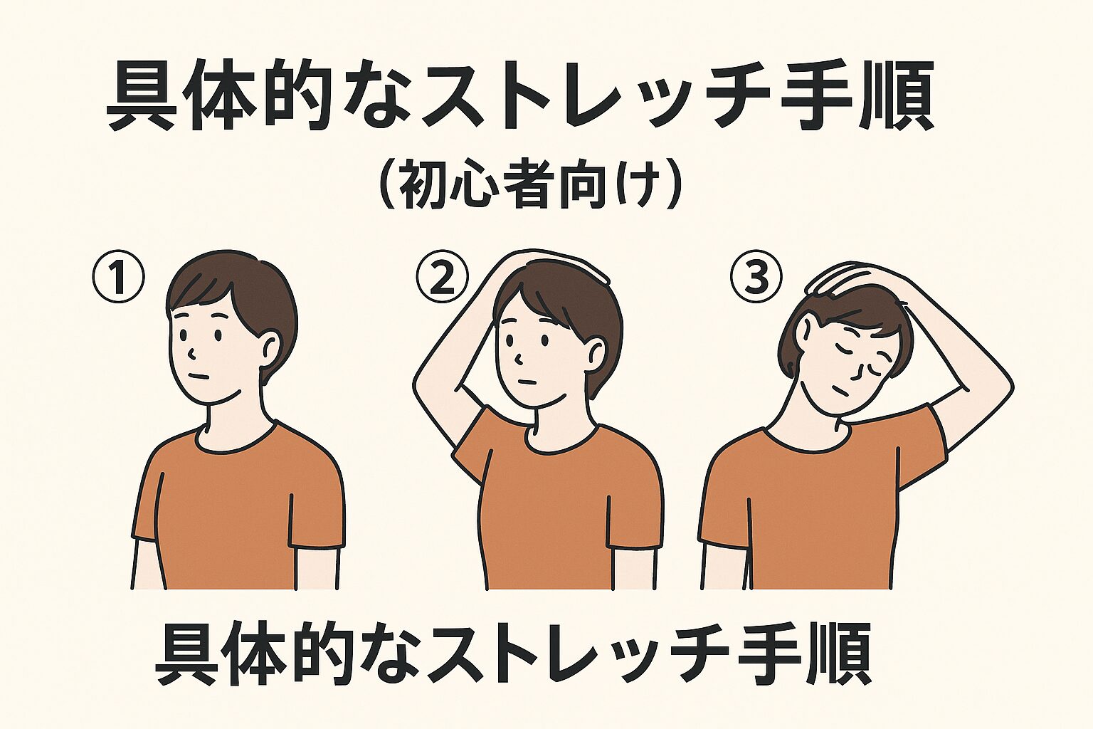ここからは、初心者向けの「頭板状筋 ストレッチ」を、イメージしやすいように手順①〜③に分けて説明します。