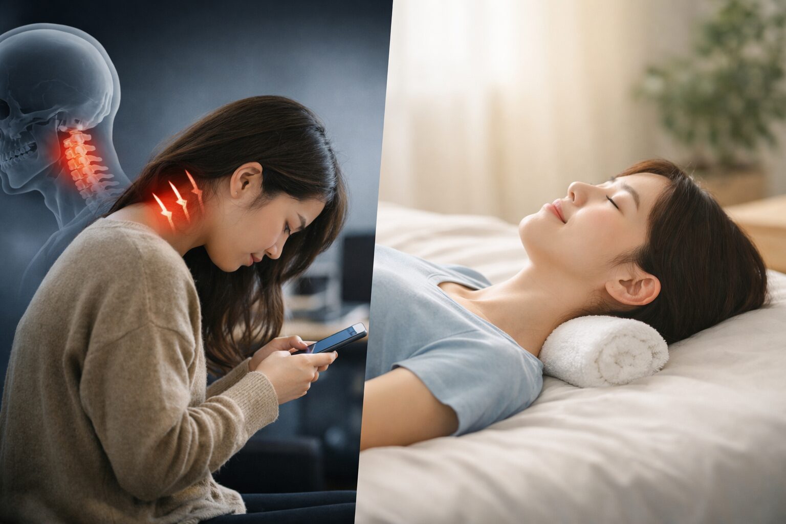 「首こりって、なんでこんなに起こりやすいの?」と思う方は多いですよね。首こりは、スマホを見る時間の長さや前かがみの姿勢、同じ体勢が続くことによる血流の低下などが重なって起こりやすいと言われています。とくに、顔が前に出る姿勢が続くと、首まわりの筋肉に負担がかかりやすくなるそうです。参考記事でも、寝ながらスマホを使う習慣は首のカーブが失われる一因になりうると紹介されています。こうした状態が続くと、いわゆるストレートネックと関係すると考えられています。