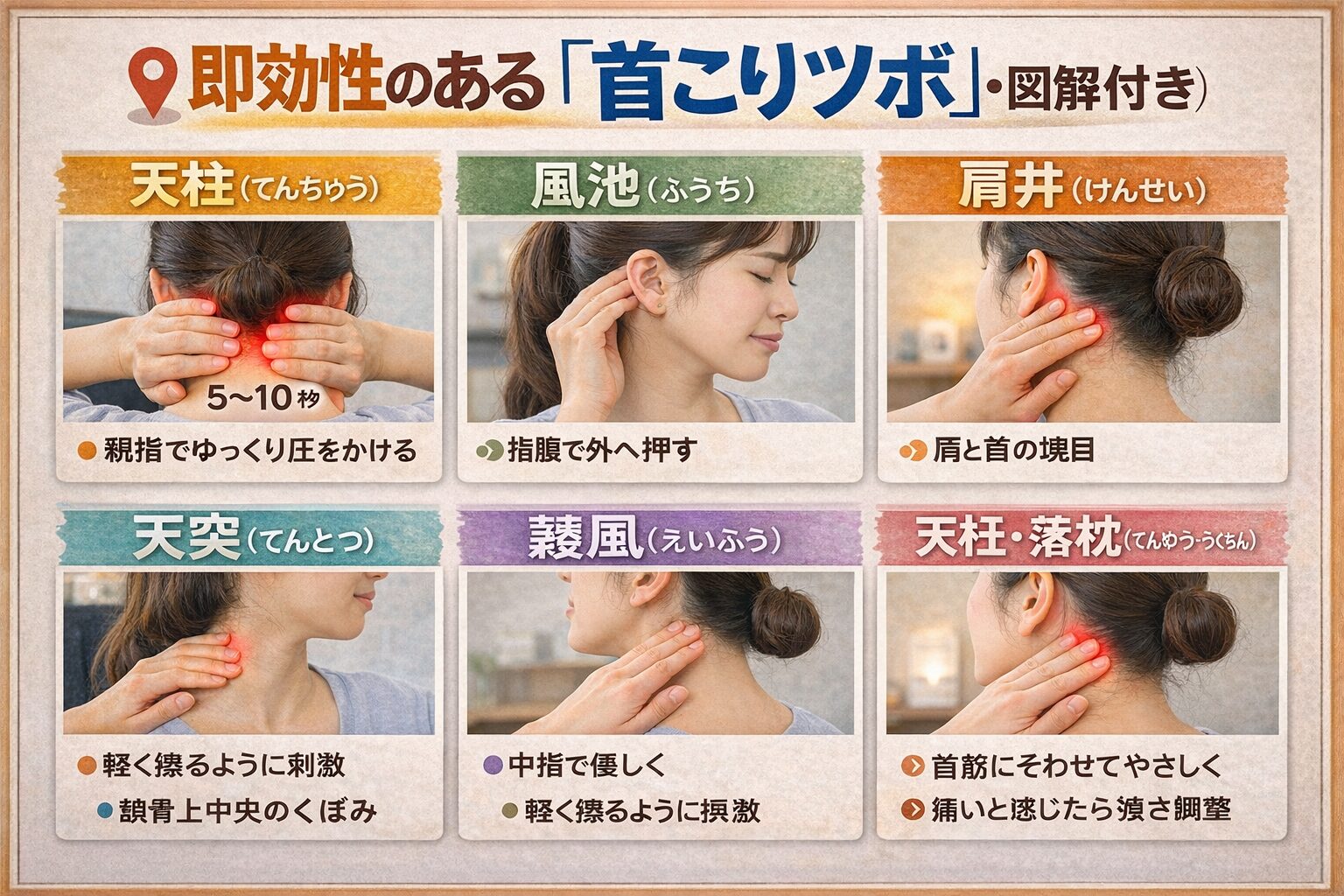 この記事では、初心者の方でもわかりやすいように、首こりのツボを図解イメージで紹介しながら、自宅で無理なく続けやすい方法をお伝えしていきます。