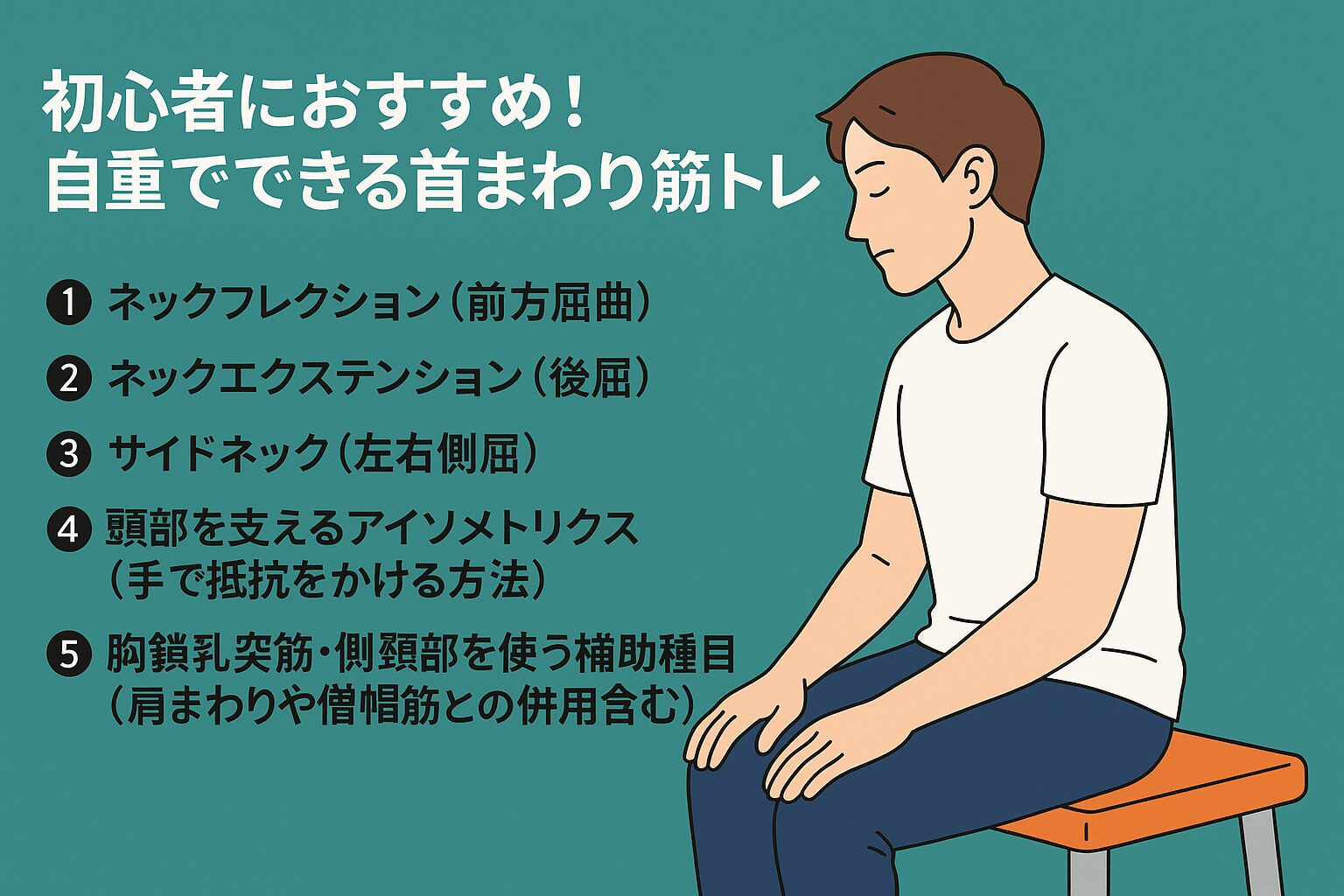 首の筋肉は繊細なので、いきなり強い負荷をかけると痛めやすい部位です。最初は自重やアイソメトリクス(静止状態での筋収縮)から始め、徐々に回数やセット数を増やしていくのがおすすめです。