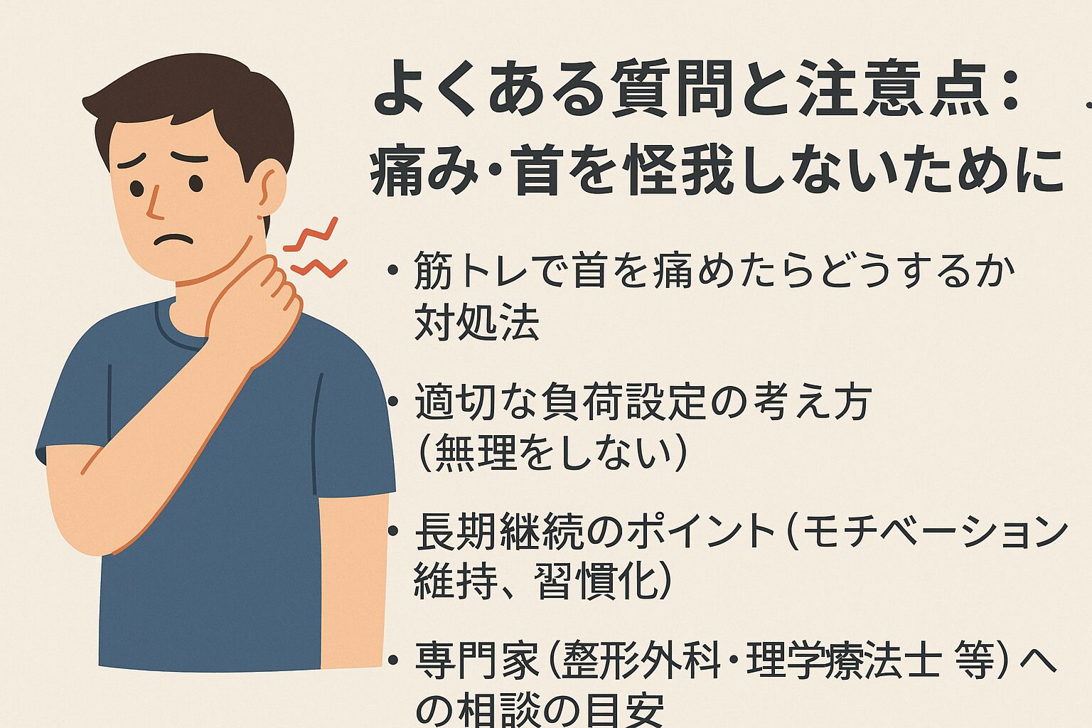 首まわりの筋トレは非常に効果的だといわれていますが、やり方を間違えると痛みや違和感が出ることがあります。ここでは、初心者からよく寄せられる質問と、トレーニングを安全に続けるためのポイントをまとめました(引用元:uFitメディア)。